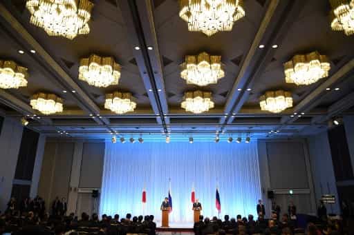 Japan's Prime Minister Shinzo Abe and Russia's President Vladimir Putin attend a press conference after the G20 Summit in Osaka on June 29, 2019. (Photo by Yuri KADOBNOV / POOL / AFP)