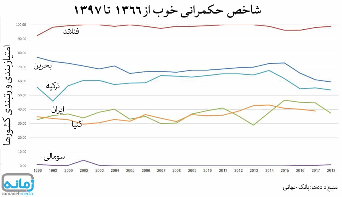 نمودار۱ شاخص اثربخشی حکمرانی خوب چند کشور را مقایسه میکند. این شاخص حدود ۵۰ فاکتور را در بر میگیرد که از آزادی فردی و اجتماعی تا امکان بهرهبری از رفاه عمومی و سیاستهای باز اقتصادی و نظام اداری و قضایی شفاف و بسیاری موارد دیگر را در بر میگیرد[۱]. رتبهبندی میان ۲۰۰ کشور و دولت مستقل جهان و بین صفر تا صد امتیاز (بدترین و بهترین کشور) انجام شده است.
