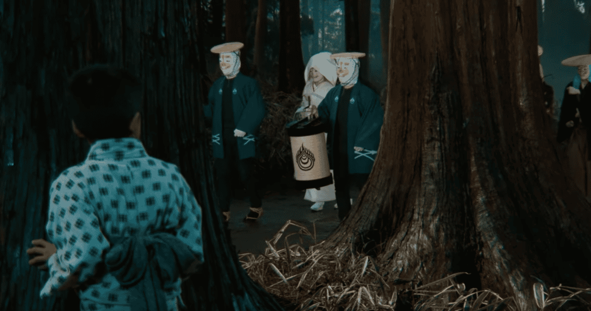در یک روز آفتابی که باران هم میبارد پسربچهای در ایوان ایستاده است مادرش وارد ایوان میشود و به او میگوید که در خانه بماند چون وقتی هوا آفتابی و بارانی است نشانهایست از آنکه روباهها در تدراک مراسم عروسی هستند و دوست ندارند کسی مراسم آنها را ببیند و از این کار خیلی ناراحت میشوند. پسر از هشدار مادر سرپیچی میکند و به جنگل میرود و شاهد مراسم پر رمز و راز تدارک عروسی روباهان میشود که روباهان متوجه حضور او میشوند. پسر کمی هراسان میشود و محل را ترک میکند. دلنگران به خانه برمیگردد، مادر در ورودی ایوان منتظر اوست و میگوید کاری را که نباید میکردی انجام دادی و به تماشا رفتی. سپس از آستینش شیای را بیرون میآورد و به پسر میدهد و میگوید که این را یک روباه عصبانی برای تو آورد. ظاهرا باید به زندگی خودت خاتمه بدهی. پسر آن شی را که خنجری است در غلاف، باز میکند، مادر میگوید که باید به دیدار روباهان بروی و این را به آنها بدهی و طلب بخشش کنی و تا زمانی که آنها تو را نبخشند من نمیتوانم تو را به خانه راه بدهم و این را هم یادآوری میکند که آنها به ندرت کسی را میبخشند. مادر در تصمیم خود کاملا قاطع به نظر میآید و در را به روی پسر میبندد ولی قبل از اینکه در کاملا بسته شود پسر میگوید "ولی من نمیدانم روباهها کجا هستند" مادر میگوید روزی مثل امروز که رنگینکمان است روباهها را در زیر رنگینکمان پیدا میکنی و در را میبندد. پسر به سمت دشت پر از گل در دامنه کوه میرود جائی که رنگین کمان خیمه زده است.