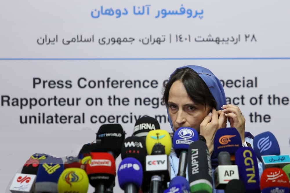 خانم آلنا دوهان در روز آخر سفر خود به ایران یک کنفرانس مطبوعاتی برگزار کردند و تأثیر تحریمهایی اعمال شده توسط ایالات متحده بر ایران را «ویرانگر» و «غیرقانونی» توصیف کرد و خواستار لغو آنها شد.