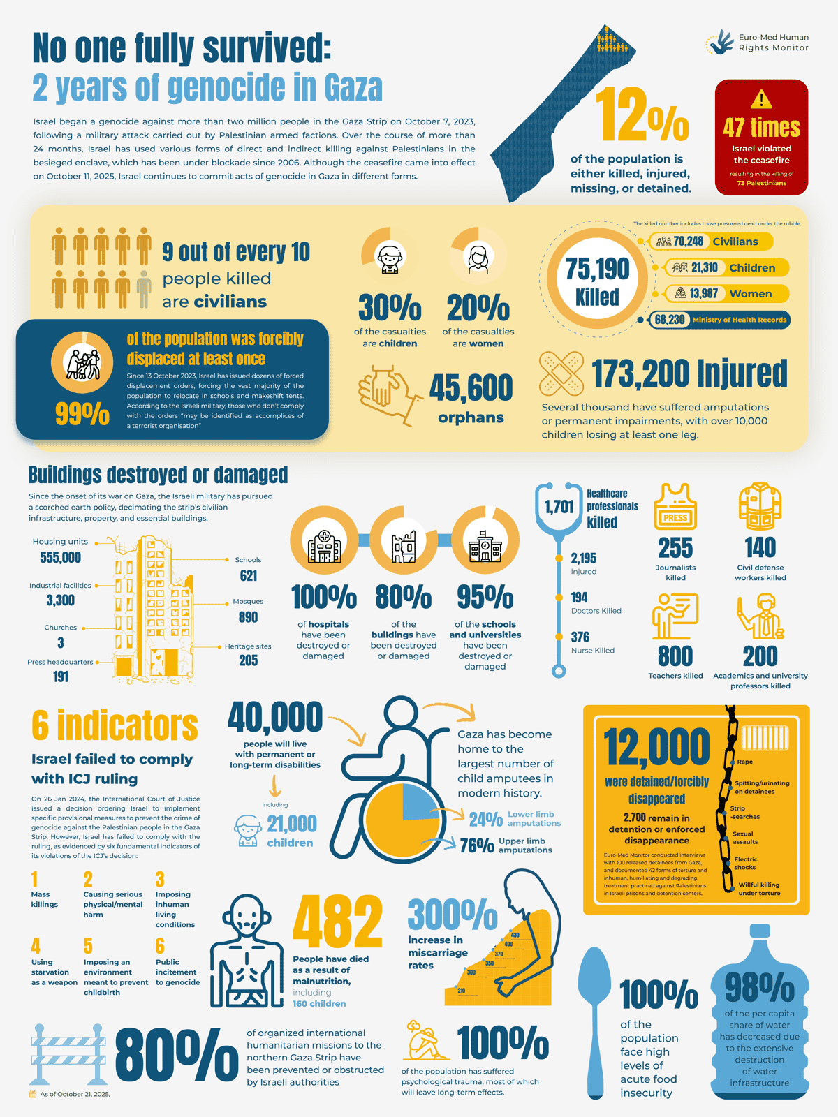 دیدهبان حقوق بشر اروپا-مدیترانه ۲۲ اکتبر ۲۰۲۵ ارقام ثبت شده در گزارش اولیه خود را از «نسلکشی در غزه به دست اسراییل»، تکاندهنده توصیف کرد و گفت: