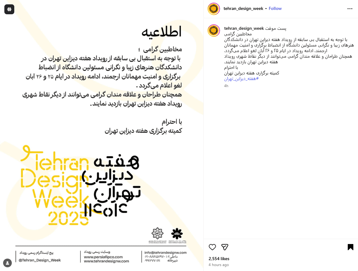 رویداد «هفته دیزاین تهران» در دانشکده هنرهای زیبای دانشگاه تهران روز یکشنبه ۲۵ آبان، پس از چند روز حواشی و انتشار ویدئوهایی در شبکههای اجتماعی، متوقف شد. دانشگاه تهران در اطلاعیه رسمی خود علت این تصمیم را «کثرت کمنظیر جمعیت» و «مخاطرات ایمنی ناشی از تراکم بازدیدکنندگان» اعلام کرد و توضیح داد که ترکیب نور و ادوات برقی در کنار ازدحام، احتمال بروز حادثه را افزایش داده است.