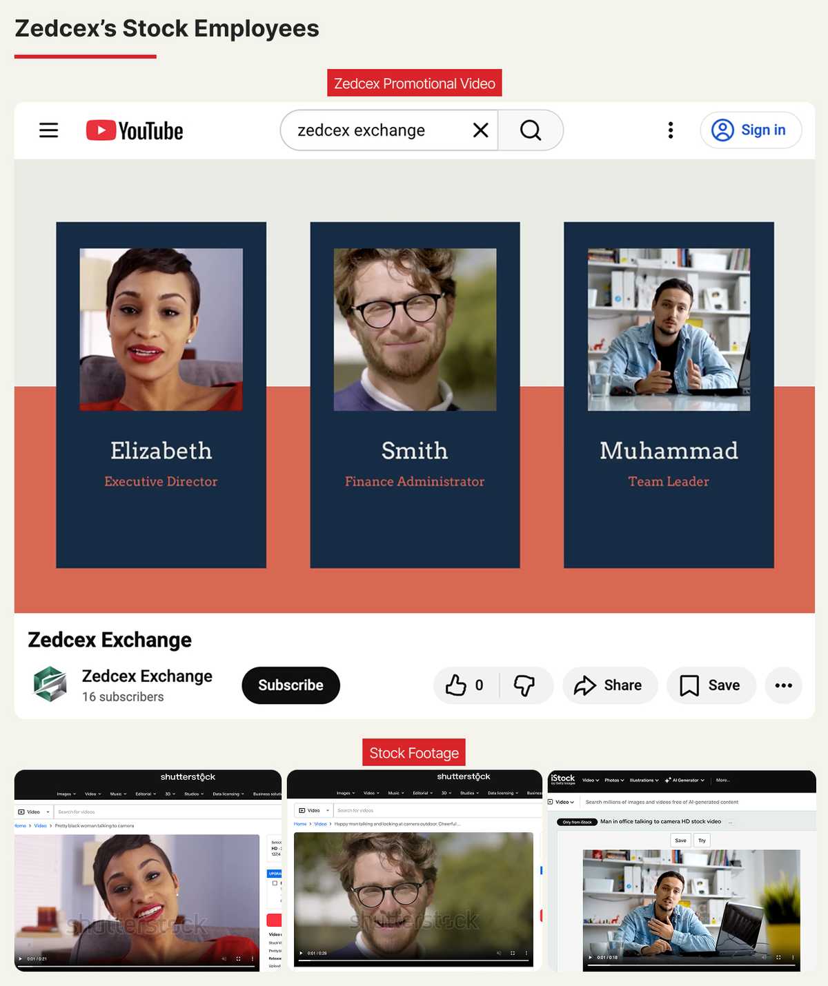 در یک ویدیو تبلیغاتی رسمی از «زدکسیون» در مارس ۲۰۲۲، تصویری از زنی به نام «الیزابت» نمایش داده شد که بهعنوان «مدیر اجرایی» پلتفرم معرفی شده بود. در واقع، آن زن یک مدل در ویدیوهای آماده (Stock Footage) بود که در سایت شاتراستاک با عنوان «زن سیاهپوست زیبا در حال صحبت با دوربین» قرار داشت.