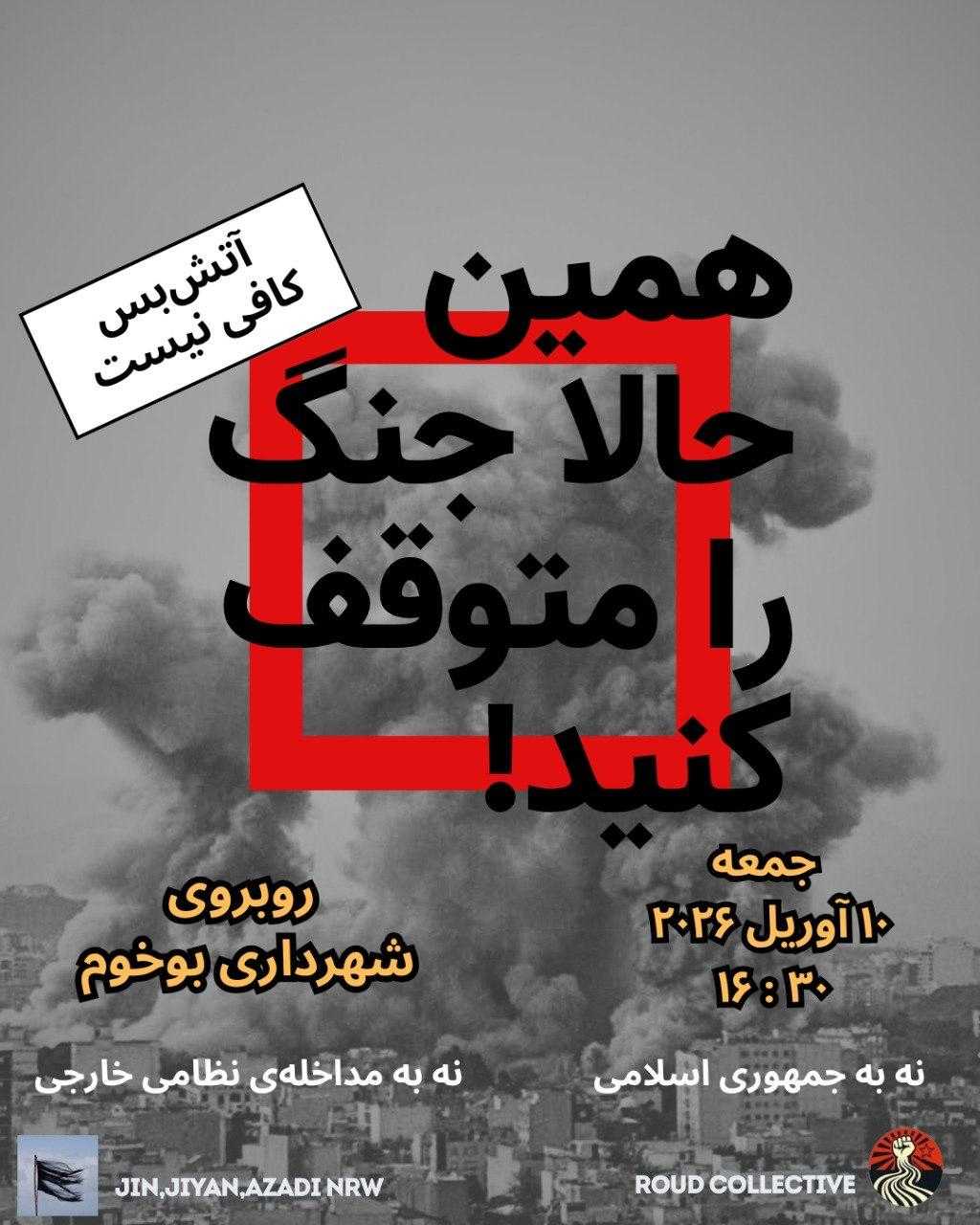 در ۲۱ فروردین ۱۴۰۵، کلکتیو ژن، ژیان، ئازادی NRW و کلکتیو رود در بوخوم تجمعی ضد جنگ برپا کردند. این رویداد در واکنش به تهاجم نظامی ایالات متحده و اسرائیل به ایران و پیامدهای ویرانگر آن برای کارگران، زنان و زندانیان سیاسی پس از کشتارهای دیماه جمهوری اسلامی شکل گرفت. سخنرانان از جمله نماینده حزب مارکسیست لنینیست، بر ضرورت تبدیل نگرانیهای اخلاقی به جنبش جهانی ضدجنگ تأکید کردند.