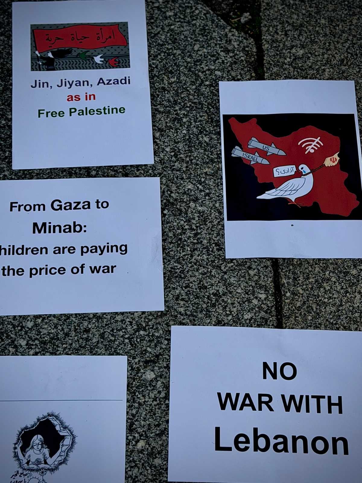 متن انگلیسیای نیز قرائت شد که به حملات به زیرساختهای اقتصادی مانند فولاد خوزستان، مبارکه، پتروشیمی عسلویه و ماهشهر، کشتهشدن ۱۱ کارگر در نقده، بیکاری فوری و فراگیر کارگران، آسیب به کسب و کارهای زنانهی وابسته به اینترنت و قطع معیشت آنان، و ادامهی سرکوب در ایران با حداقل ۱۴ اعدام پس از ۲۸ بهمن ۱۴۰۴ و ایستهای بازرسی و جو امنیتی در شهرها اشاره داشت.